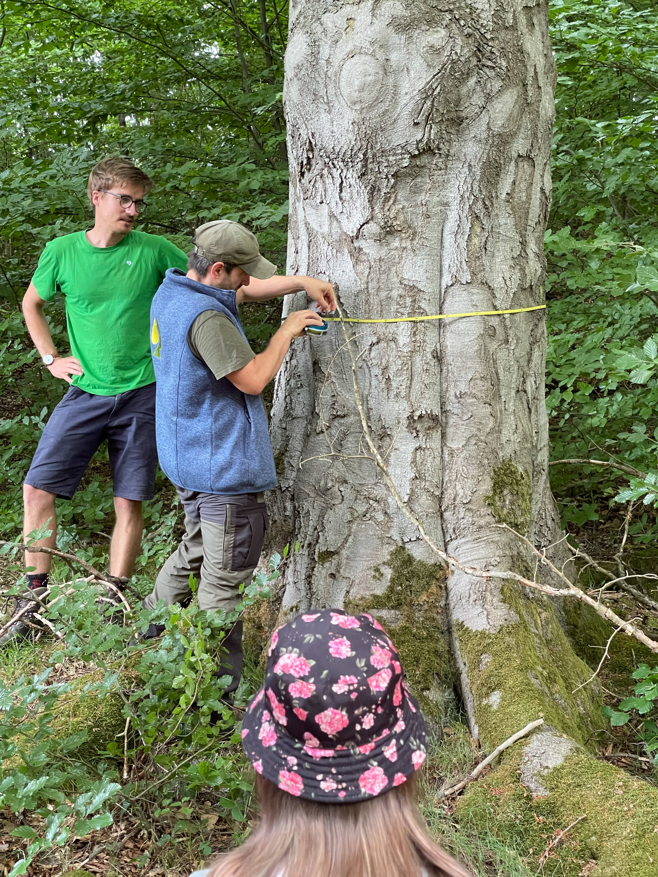 Ein besonderes Highlight auf der Wanderung war die Schäferlinde – ein imposanter, als Naturdenkmal geschützter Baum am Wegesrand. Dort wendeten die Schülerinnen und Schüler ihr neu erworbenes Wissen praktisch an: Mit Maßband und Taschenrechner bestimmten sie den Umfang der Linde und schätzten ihr Alter.