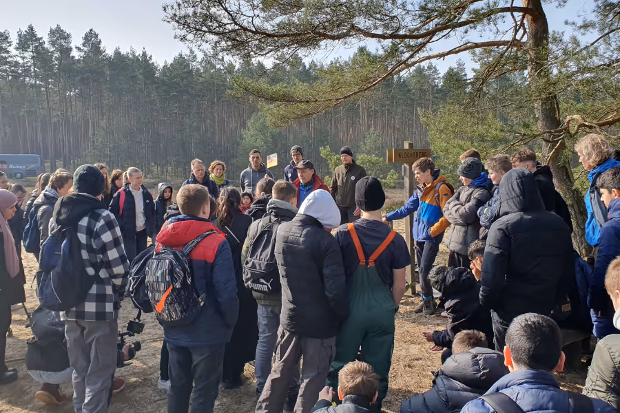 Bei bestem Sonnenschein startete der Tagesausflug für die Schüler:innen an der Grenzsäule 319. Nach einer kurzen Begrüßung durch die SUNK-Mitarbeiter:innen und Jürgen Starck, Umweltehrenpreisträger Sachsen-Anhalt, gab es ein paar kurze historische Fakten zu dem geschichtsträchtigen Ort. Dann ging es für die Gruppe los entlang des Kolonnenweges über sandige Heidelandschaft und Silbergras Richtung Mahnmal „Simon-Kreuz”. Doch die Geschichte vom einstigen Fluchtversuch aus der DDR sollte nicht die einzige spannende und emotionale Geschichte des Tages bleiben.