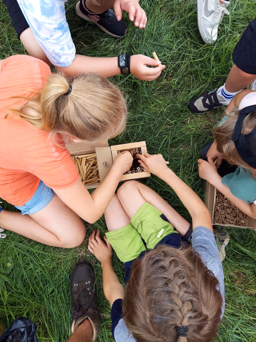 Doch damit nicht genug: An zwei weiteren Stationen der SUNK-Entdecker-Klasse dreht sich alles um Wildbienen und das Biotopverbundsystem Grünes Band. SUNK-Mitarbeiter Benjamin Hoppe leitet ein Spiel zum Biotopverbund, bei dem die Kinder die Ansprüche wandernder Tierarten entdecken und Kollege Adrian Kanis vermittelt erlebbares Wissen über Insekten – Wildbienen inklusive. Auch hier schreiten die Kinder selbst zur Tat: Sie sammeln Insekten direkt vor Ort und nehmen die Krabbler im sogenannten Aerarium ganz genau unter die Lupe.